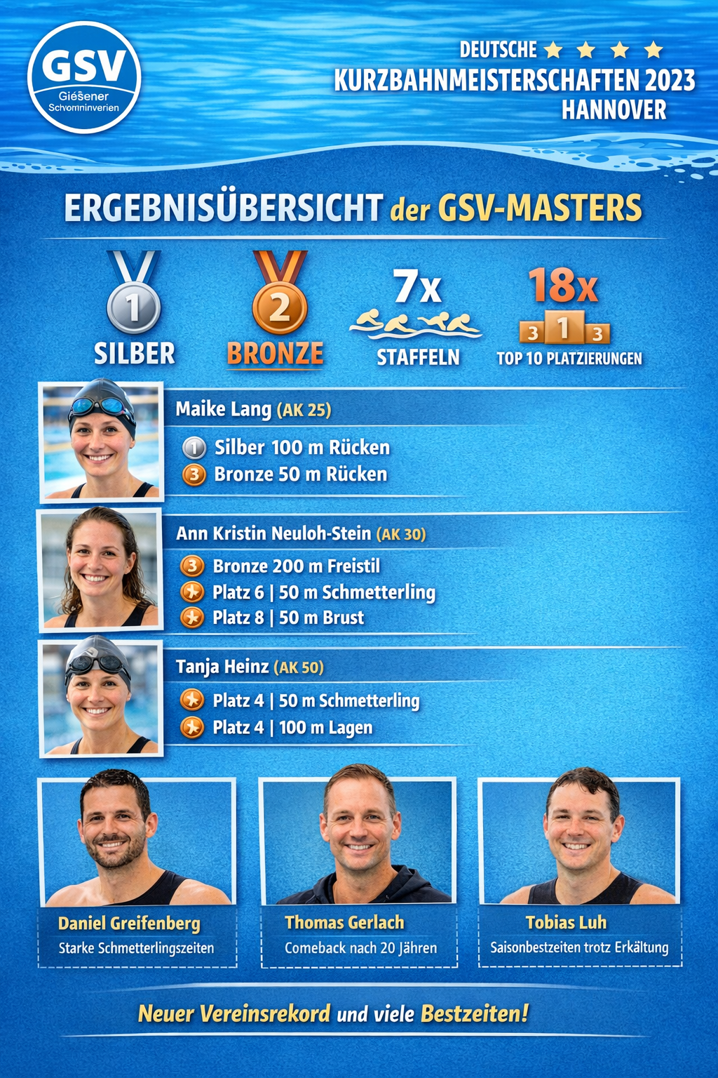 Mit drei Medaillen, einem neuen Vereinsrekord, zahlreichen Top-10-Platzierungen und vielen Saisonbestzeiten haben die GSV-Masters bei den Deutschen Kurzbahnmeisterschaften 2023 in Hannover eindrucksvoll gezeigt, dass sie national weiterhin zur Spitze zählen. Die Ergebnisse bestätigen die intensive Vorbereitung der vergangenen Wochen und machen Lust auf die kommenden Meisterschaften — auf Kurz- wie auf Langbahn.