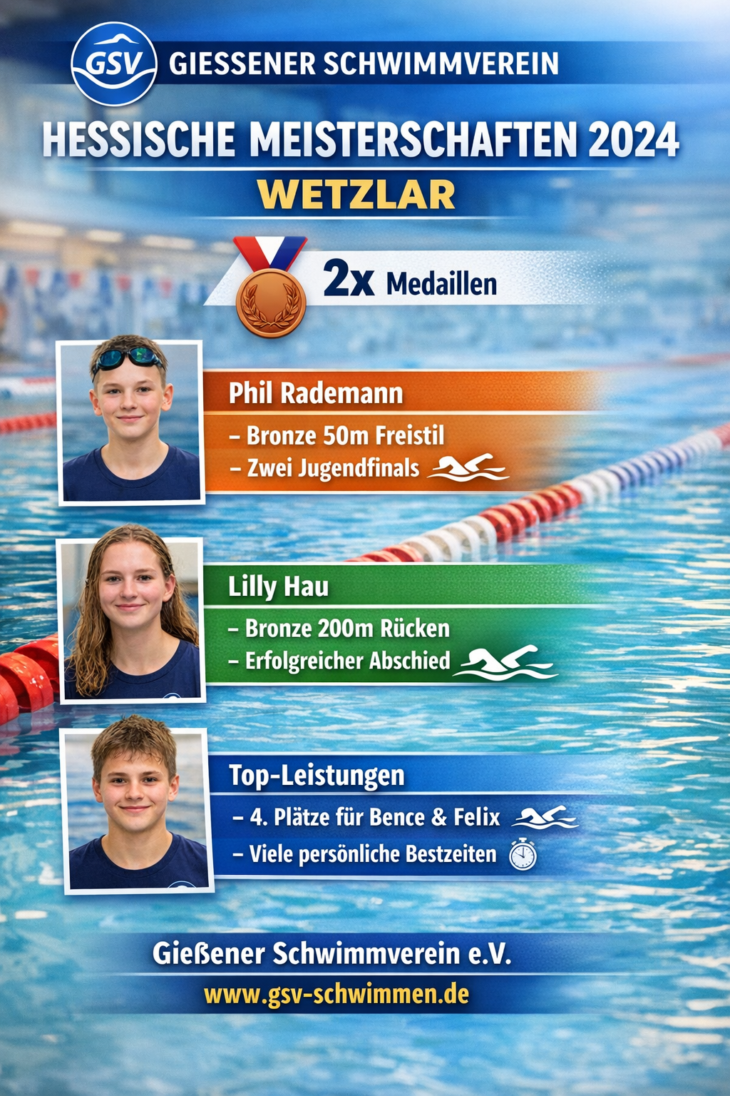 «Zwei Medaillen sind eine große Motivation für das zweite Halbjahr, in dem die Hessischen Meisterschaften auf der Kurzbahn stattfinden. Alle haben zum Saisonhöhepunkt ihre besten Leistungen gezeigt und neue Bestzeiten geschwommen. So soll es sein.»