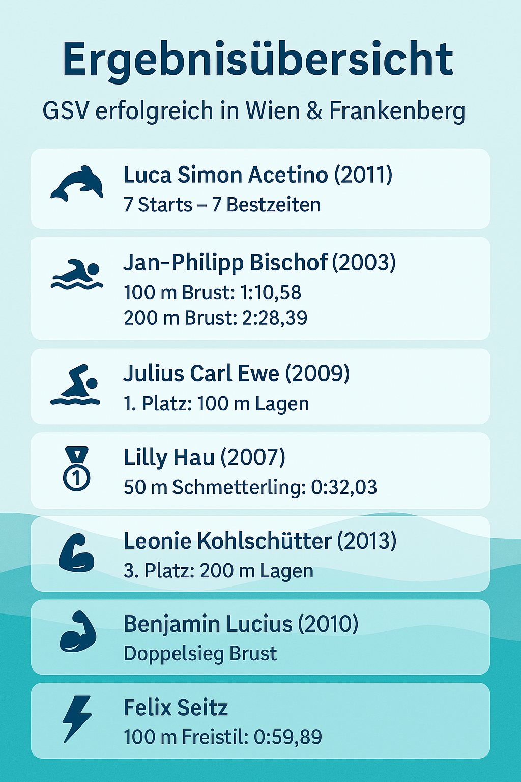 - 50 m Brust: 0:32,43 (Platz 1, schnellste GSV‑Zeit 2025)